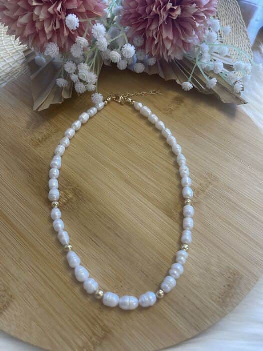 שרשרת פנינים טבעיות בגוון לבן ואלמנטים כדורי זהב