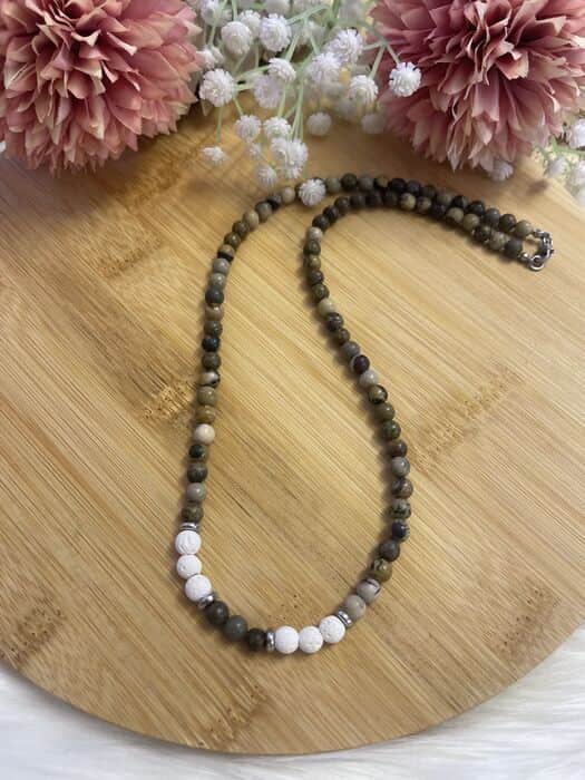 שרשרת אבני חן ג'ספר חום ואבן לבה לבן