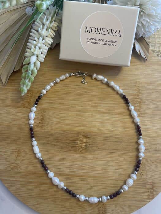 שרשרת פנינים טבעיות לבנות בשילוב אבן חן גרנט
