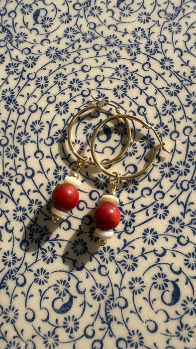 עגילי ציפוי זהב עם תליון אבן חן קורל אדום ואבני צדף