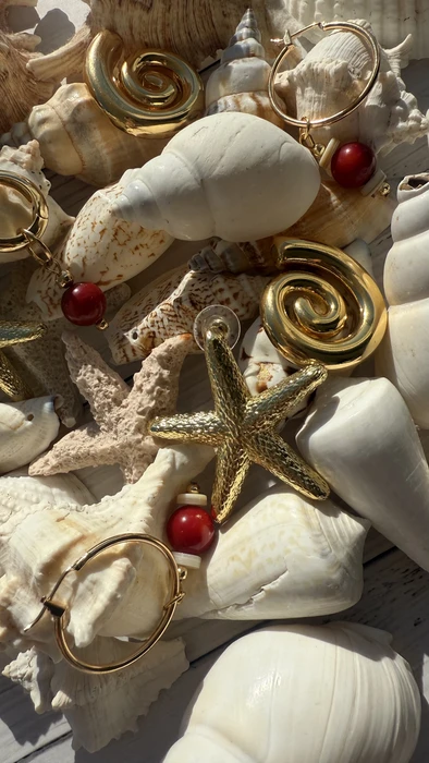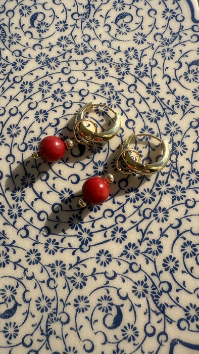 עגילי ציפוי זהב עם תליון אבן חן קורל אדום
