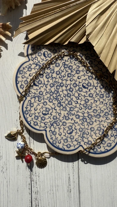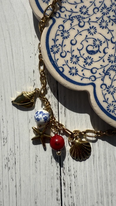 שרשרת חוליות בשילוב תליון אבן חן קורל אדום, תליון צדף,תליון קונכיה,תליון כוכב קטן,ותליון חרוז אבן קרמיקה בעבודת יד