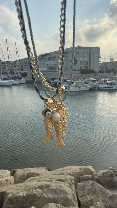 שרשרת שעשויה משרוך בצבע טורקיז עם תליון דג מלא באנרגיות טובות שפע ומזל טוב.
