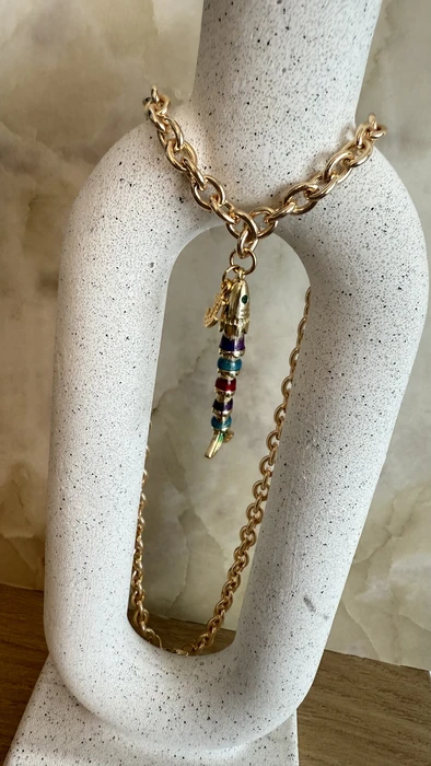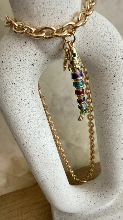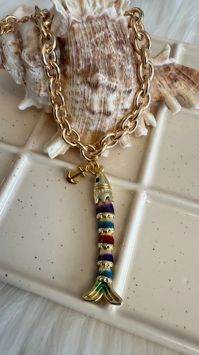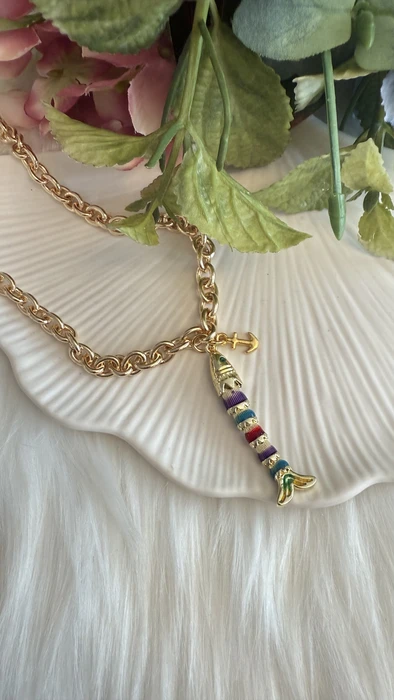 שרשרת חוליות מלאה בשיק ציפוי זהב 24K עם תליון דג משובץ בזרקונים צבעוניים
