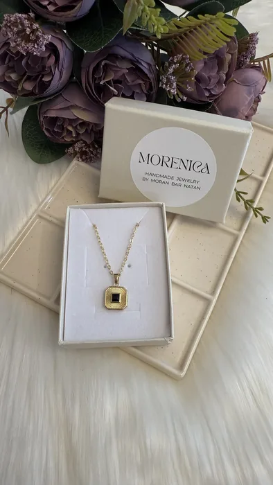 שרשרת תליון ריבוע פסים בשיבוץ אבן זרקון שחור