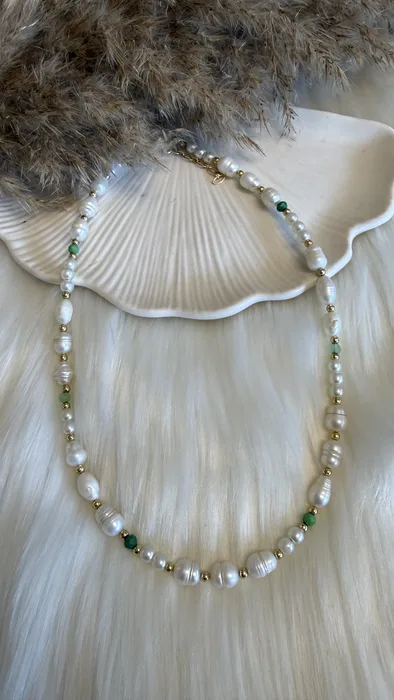 שרשרת פנינים טבעיות לבנות בשילוב אבני קריסטל לזכוכית בגוון ירוק