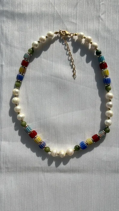 שרשרת פנינים טבעיות לבנות בשילוב אבן חן אגת וחרוזי קרמיקה בעבודת יד