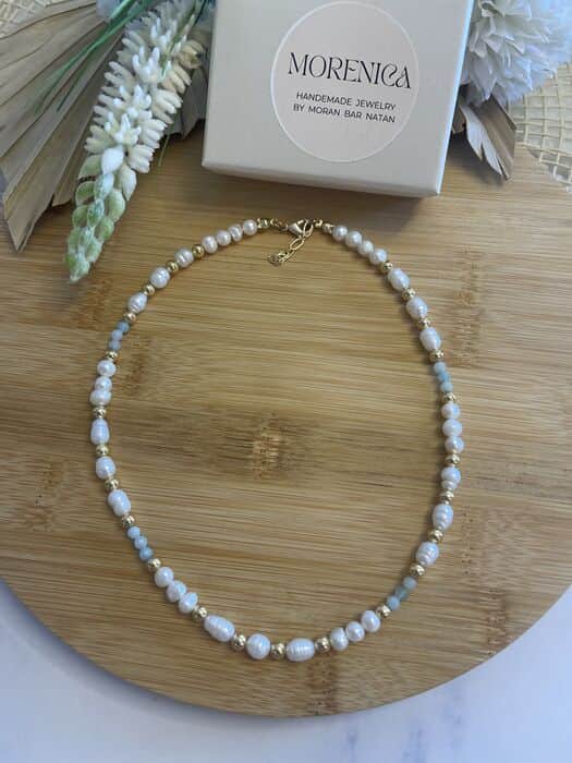 שרשרת פנינים טבעיות לבנות בשילוב אבן חן אקווה מרין