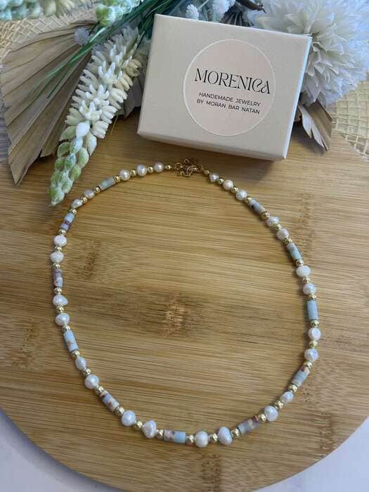 שרשרת פנינים טבעיות לבנות בשילוב אבן חן ג'ספר בגוון תכלת