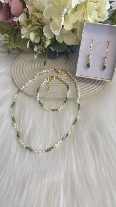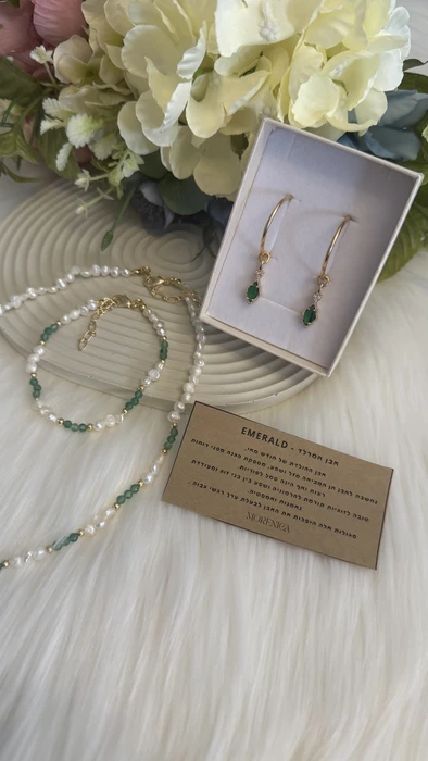 שרשרת פנינים טבעיות לבנות בשילוב אבן חן אמרלד