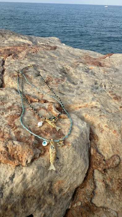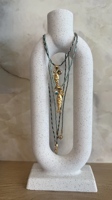 שרשרת שעשויה משרוך בצבע טורקיז עם תליון דג מלא באנרגיות טובות שפע ומזל טוב.
