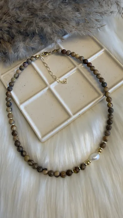 שרשרת יערה - אבן חן ג'ספר גוון חום בשילוב פנינה
